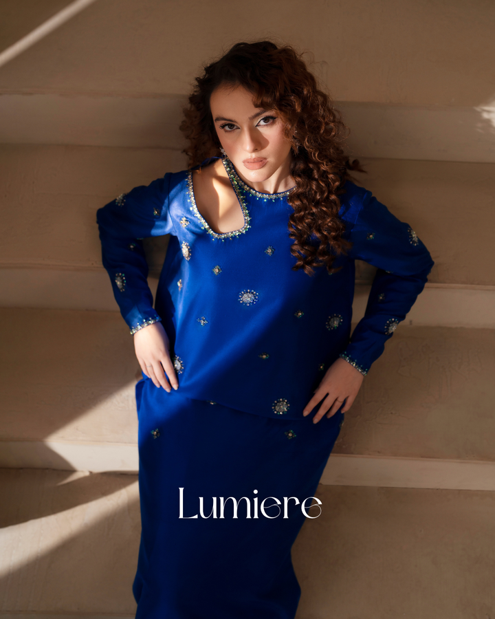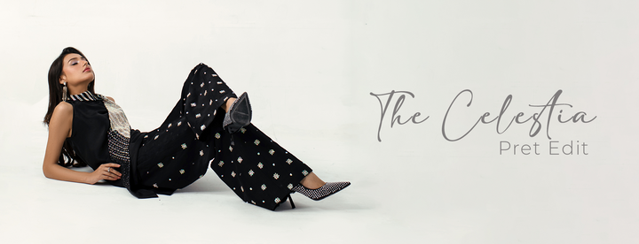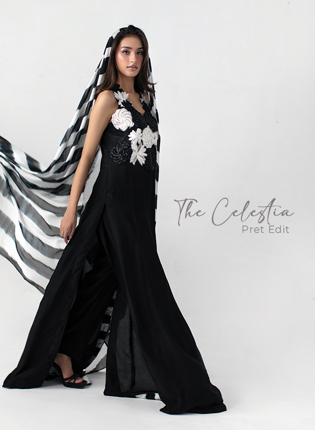Description: This Timeless black outfit features all over embellishment with silver stones on shirt and trouser with the addition of handmade tassels on sleeves complements the shirt,