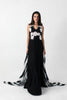 Grace meets sophistication in Elyndra, a timeless black ensemble crafted from luxurious tussle silk. The gown features exquisite hand-embroidered floral detailing in monochrome tones, creating a striking contrast of elegance and modern artistry. Paired with a striped dupatta that adds a contemporary flair, Elyndra embodies effortless charm and celestial grace.